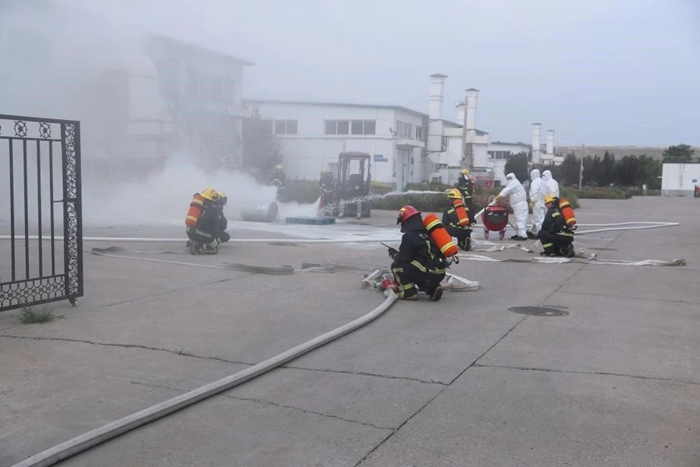 为进一步筑牢安全生产防线,压紧压实安全生产责任, 6月底,华腾化工组织开展了2024年危险化学品火灾事故应急演练。此次演练模拟场景为危险化学品库房入库作业时发生丙酮泄露着火,开展了火灾上报与先期处置、人员疏散逃生、微型消防站和消防救援队灭火等环节的演练科目。